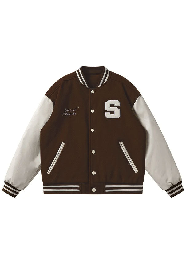 Dark Brown baseball jacket, crafted from very soft, high-quality 280 gsm fleece fabric. This jacket features a distinctive patched letter "S," adding a unique flair to your wardrobe.